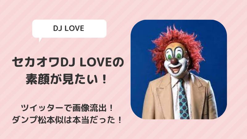 SEKAI NO OWARI(セカオワ)のDJ LOVEさんといえば、ピエロのマスクが印象的。 未だに素顔は公開されていません。 隠されるとどんな顔をしているのか気になりますよね! DJ LOVEの素顔が見たい! と思っている方は多いのではないでしょうか。 今回なんとDJ... -